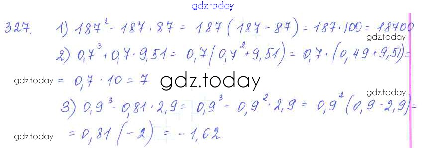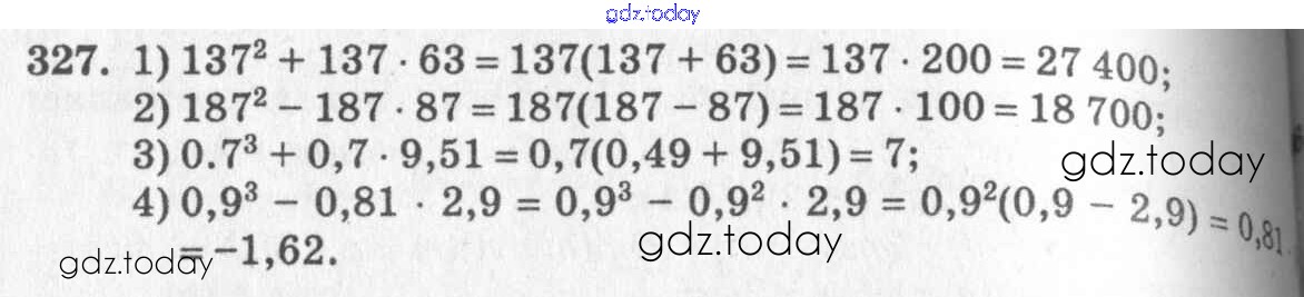 На страницах сайта gdz.today вы найдете учебный и вспомогательный материал, направленный на улучшения знаний школьной программы. ГДЗ - онлайн мир знаний §19. Вынесение общего множителя за скобки Решение к главе 4. Разложение многочленов на множители 327 Учебнику по Алгебре для 7 класса Колягин, Ткачёва Просвещение 2014