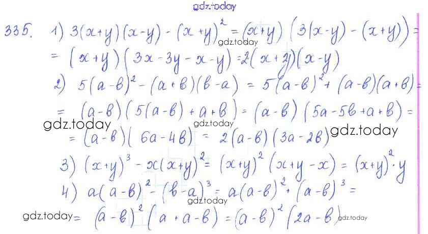 На страницах сайта gdz.today вы найдете учебный и вспомогательный материал, направленный на улучшения знаний школьной программы. ГДЗ - онлайн мир знаний §19. Вынесение общего множителя за скобки Решение к главе 4. Разложение многочленов на множители 335 Учебнику по Алгебре для 7 класса Колягин, Ткачёва Просвещение 2014