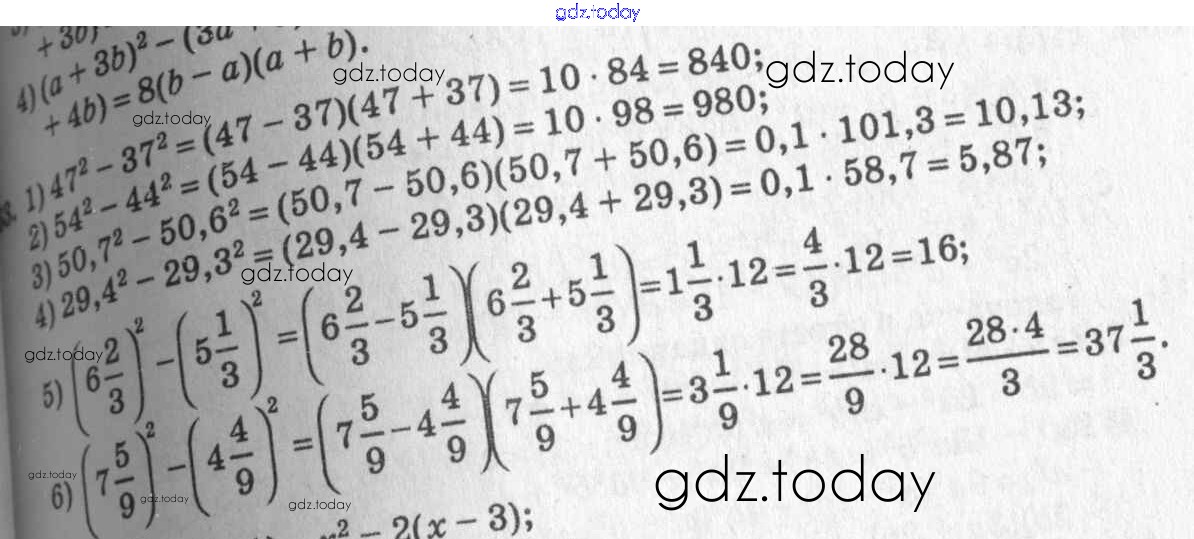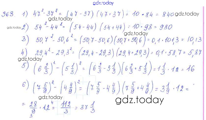На страницах сайта gdz.today вы найдете учебный и вспомогательный материал, направленный на улучшения знаний школьной программы. ГДЗ - онлайн мир знаний §21. Формула разности квадратов Решение к главе 4. Разложение многочленов на множители 363 Учебнику по Алгебре для 7 класса Колягин, Ткачёва Просвещение 2014