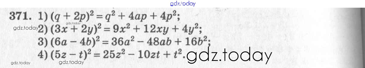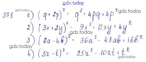 На страницах сайта gdz.today вы найдете учебный и вспомогательный материал, направленный на улучшения знаний школьной программы. ГДЗ - онлайн мир знаний §22. Квадрат суммы. Квадрат разности Решение к главе 4. Разложение многочленов на множители 371 Учебнику по Алгебре для 7 класса Колягин, Ткачёва Просвещение 2014