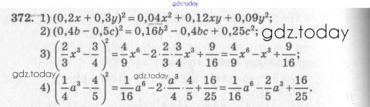 На страницах сайта gdz.today вы найдете учебный и вспомогательный материал, направленный на улучшения знаний школьной программы. ГДЗ - онлайн мир знаний §22. Квадрат суммы. Квадрат разности Решение к главе 4. Разложение многочленов на множители 372 Учебнику по Алгебре для 7 класса Колягин, Ткачёва Просвещение 2014