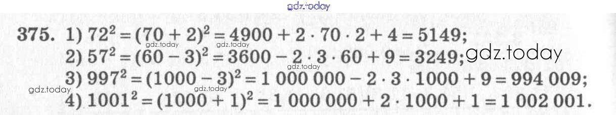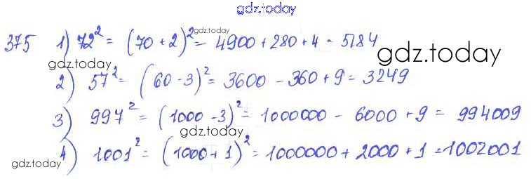 На страницах сайта gdz.today вы найдете учебный и вспомогательный материал, направленный на улучшения знаний школьной программы. ГДЗ - онлайн мир знаний §22. Квадрат суммы. Квадрат разности Решение к главе 4. Разложение многочленов на множители 375 Учебнику по Алгебре для 7 класса Колягин, Ткачёва Просвещение 2014