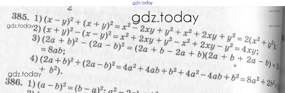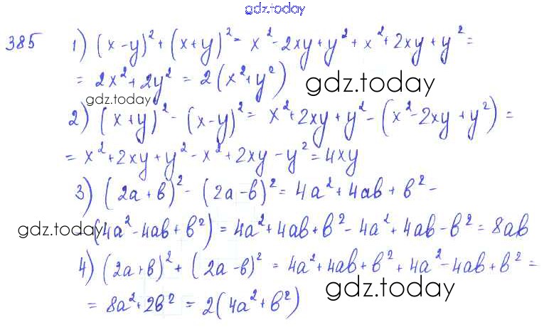 На страницах сайта gdz.today вы найдете учебный и вспомогательный материал, направленный на улучшения знаний школьной программы. ГДЗ - онлайн мир знаний §22. Квадрат суммы. Квадрат разности Решение к главе 4. Разложение многочленов на множители 385 Учебнику по Алгебре для 7 класса Колягин, Ткачёва Просвещение 2014