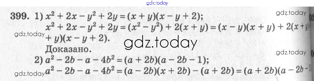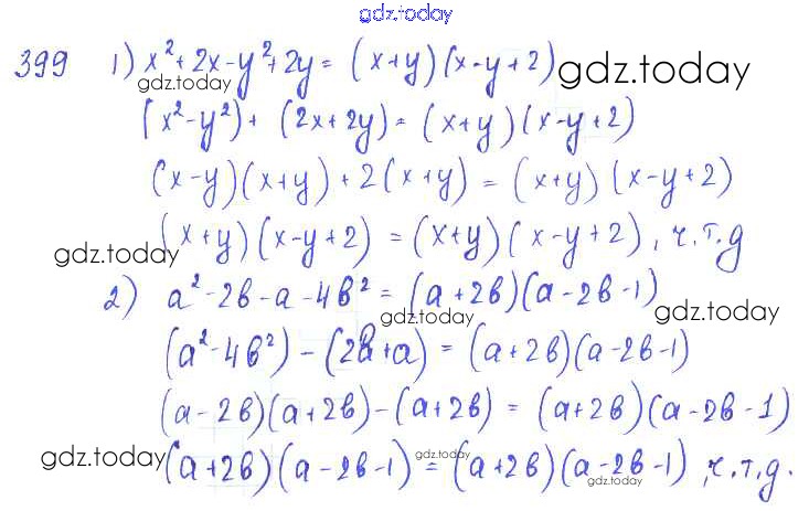На страницах сайта gdz.today вы найдете учебный и вспомогательный материал, направленный на улучшения знаний школьной программы. ГДЗ - онлайн мир знаний §23. Применение нескольких способов разложения многочлена на множители Решение к главе 4. Разложение многочленов на множители 399 Учебнику по Алгебре для 7 класса Колягин, Ткачёва Просвещение 2014