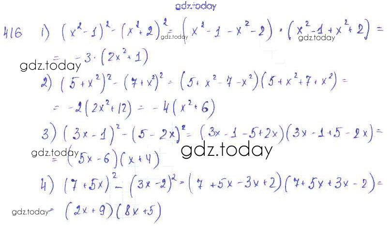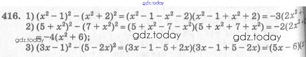 На страницах сайта gdz.today вы найдете учебный и вспомогательный материал, направленный на улучшения знаний школьной программы. ГДЗ - онлайн мир знаний Упражнения к главе 4 Решение к главе 4. Разложение многочленов на множители 416 Учебнику по Алгебре для 7 класса Колягин, Ткачёва Просвещение 2014