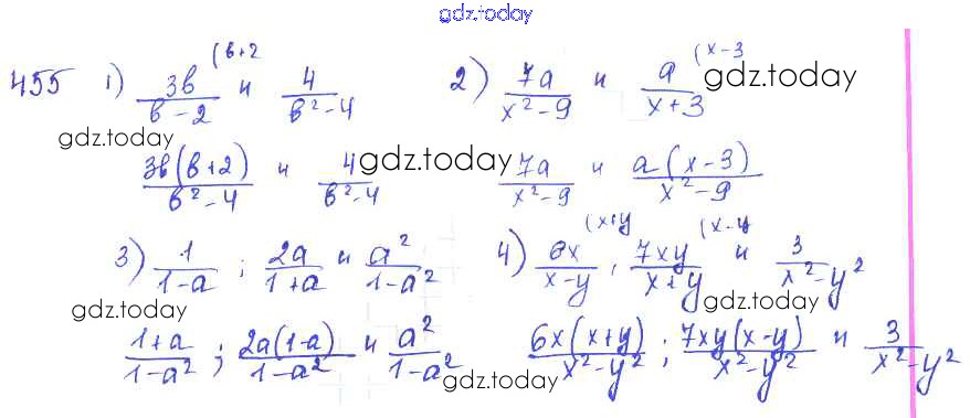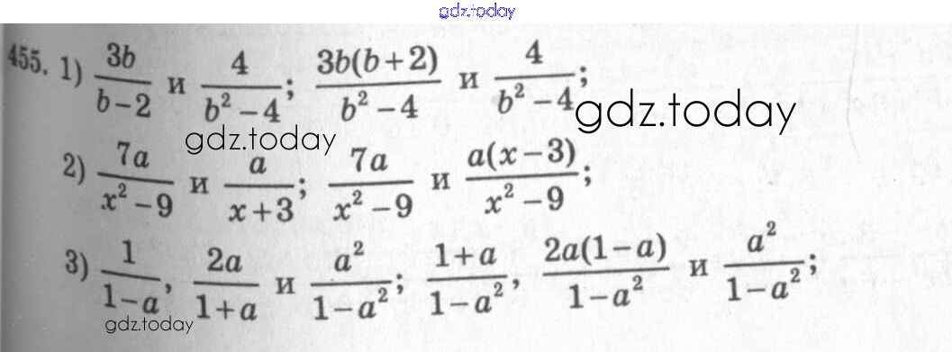На страницах сайта gdz.today вы найдете учебный и вспомогательный материал, направленный на улучшения знаний школьной программы. ГДЗ - онлайн мир знаний §25. Приведение дробей к общему знаменателю Решение к главе 5. Алгебраические дроби 455 Учебнику по Алгебре для 7 класса Колягин, Ткачёва Просвещение 2014