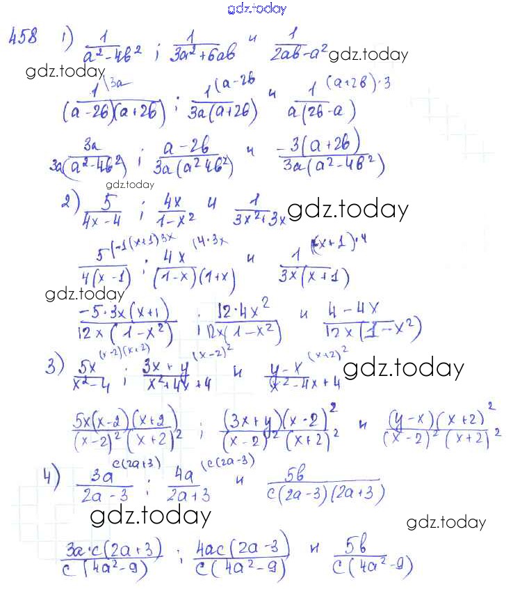 На страницах сайта gdz.today вы найдете учебный и вспомогательный материал, направленный на улучшения знаний школьной программы. ГДЗ - онлайн мир знаний §25. Приведение дробей к общему знаменателю Решение к главе 5. Алгебраические дроби 458 Учебнику по Алгебре для 7 класса Колягин, Ткачёва Просвещение 2014