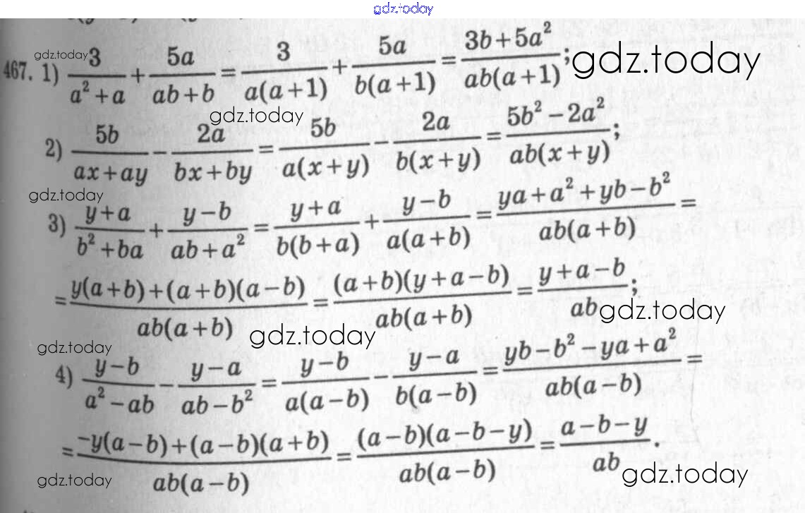 На страницах сайта gdz.today вы найдете учебный и вспомогательный материал, направленный на улучшения знаний школьной программы. ГДЗ - онлайн мир знаний §26. Сложение и вычитание алгебраических дробей Решение к главе 5. Алгебраические дроби 467 Учебнику по Алгебре для 7 класса Колягин, Ткачёва Просвещение 2014