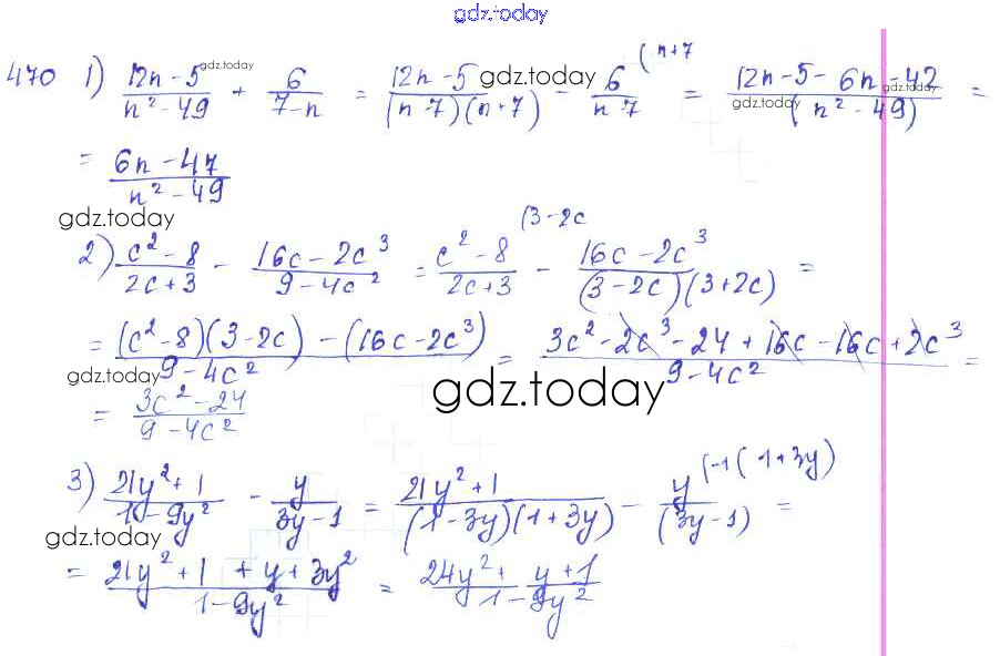 На страницах сайта gdz.today вы найдете учебный и вспомогательный материал, направленный на улучшения знаний школьной программы. ГДЗ - онлайн мир знаний §26. Сложение и вычитание алгебраических дробей Решение к главе 5. Алгебраические дроби 470 Учебнику по Алгебре для 7 класса Колягин, Ткачёва Просвещение 2014