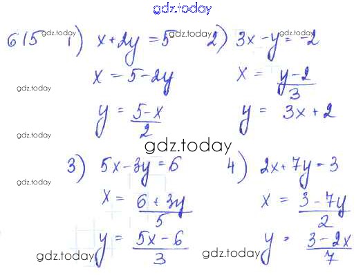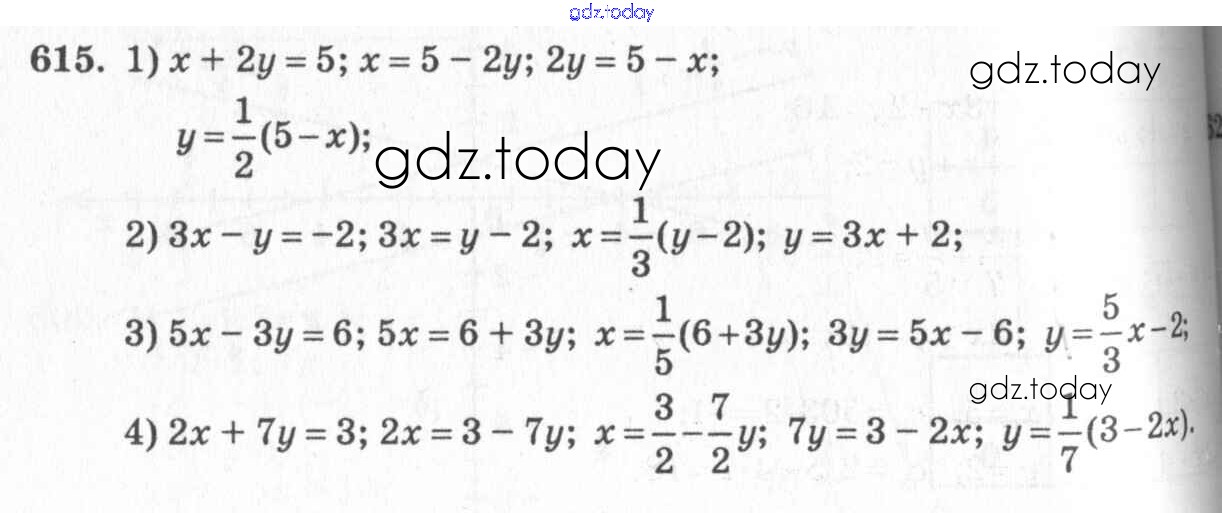Ответы к §33. Уравнения первой степени с двумя неизвестными. Системы уравнений Глава 7. Системы двух уравнений с двумя неизвестными 615 Учебнику по Алгебре для 7 класса Колягин, Ткачёва Просвещение 2014