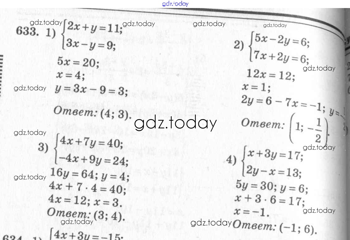 На страницах сайта gdz.today вы найдете учебный и вспомогательный материал, направленный на улучшения знаний школьной программы. ГДЗ - онлайн мир знаний §35. Способ сложения Глава 7. Системы двух уравнений с двумя неизвестными 633 Учебнику по Алгебре для 7 класса Колягин, Ткачёва Просвещение 2014