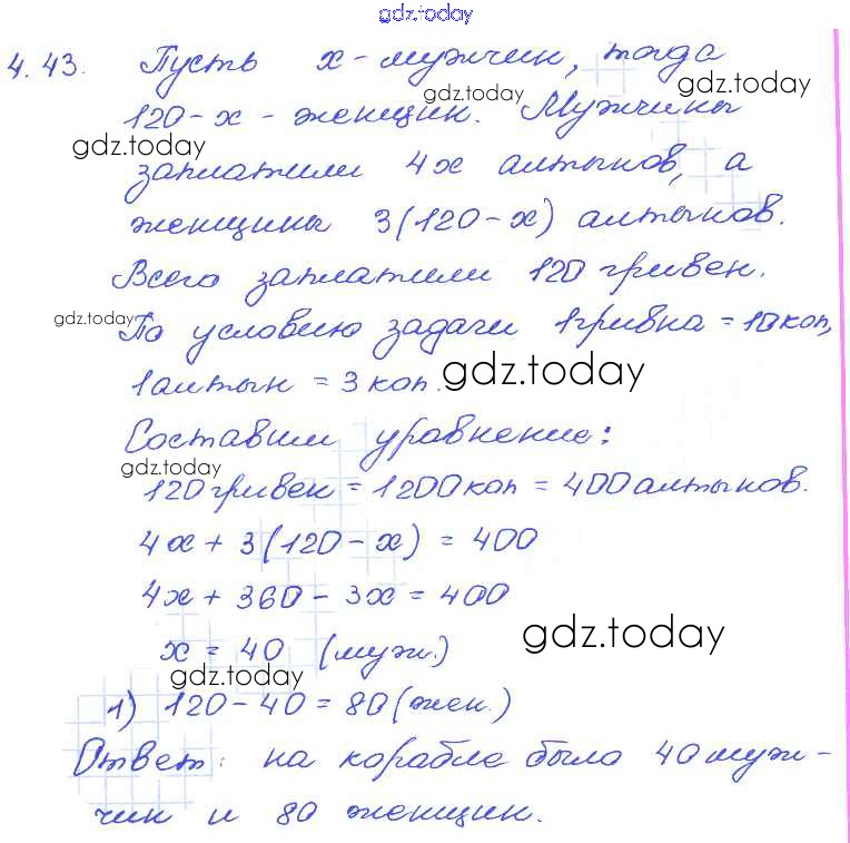 Ответы к § 4. Линейное уравнение с одной переменной Решение к главе 1 43 Задачнику по Алгебре для 7 класса Мордкович, Александрова Базовый уровень Мнемозина 2013
