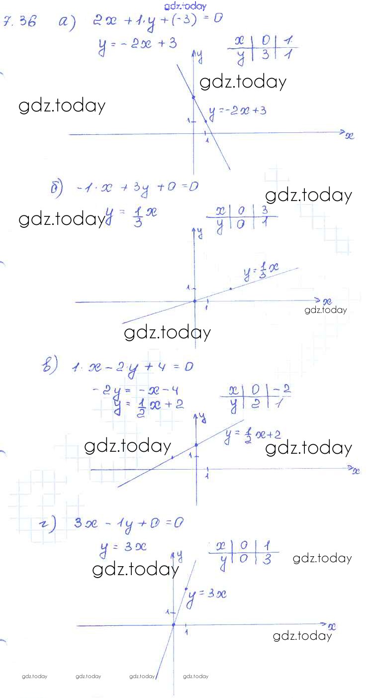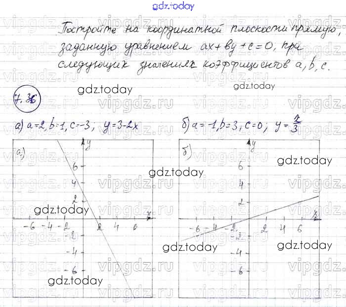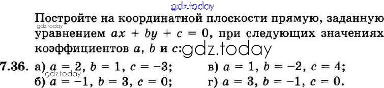 На страницах сайта gdz.today вы найдете учебный и вспомогательный материал, направленный на улучшения знаний школьной программы. ГДЗ - онлайн мир знаний § 7. Линейное уравнение с двумя переменными и его график Решение к главе 2 36 Задачнику по Алгебре для 7 класса Мордкович, Александрова Базовый уровень Мнемозина 2013