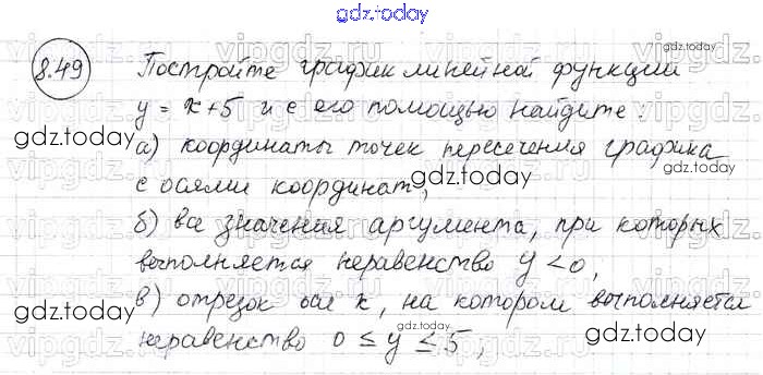 На страницах сайта gdz.today вы найдете учебный и вспомогательный материал, направленный на улучшения знаний школьной программы. ГДЗ - онлайн мир знаний § 8. Линейная функция и ее график Решение к главе 2 49 Задачнику по Алгебре для 7 класса Мордкович, Александрова Базовый уровень Мнемозина 2013