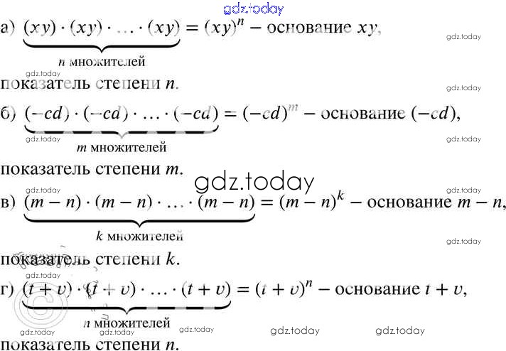 На страницах сайта gdz.today вы найдете учебный и вспомогательный материал, направленный на улучшения знаний школьной программы. ГДЗ - онлайн мир знаний § 15. Что такое степень с натуральным показателем Решение к главе 4 25 Задачнику по Алгебре для 7 класса Мордкович, Александрова Базовый уровень Мнемозина 2013