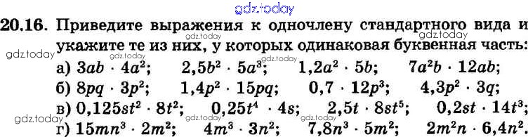 На страницах сайта gdz.today вы найдете учебный и вспомогательный материал, направленный на улучшения знаний школьной программы. ГДЗ - онлайн мир знаний § 20. Понятие одночлена. стандартный вид одночлена Решение к главе 5 16 Задачнику по Алгебре для 7 класса Мордкович, Александрова Базовый уровень Мнемозина 2013