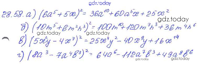 Ответы к § 28. Формулы сокращенного умножения Решение к главе 6 58 Задачнику по Алгебре для 7 класса Мордкович, Александрова Базовый уровень Мнемозина 2013