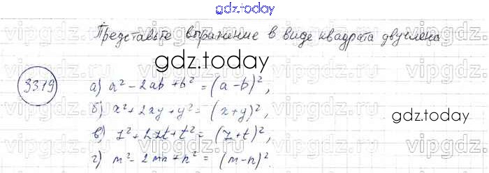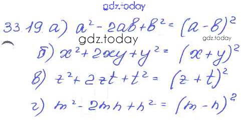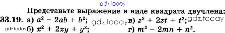 На страницах сайта gdz.today вы найдете учебный и вспомогательный материал, направленный на улучшения знаний школьной программы. ГДЗ - онлайн мир знаний § 33. Разложение многочленов на множители с помощью формул сокращенного умножения Решение к главе 7 19 Задачнику по Алгебре для 7 класса Мордкович, Александрова Базовый уровень Мнемозина 2013