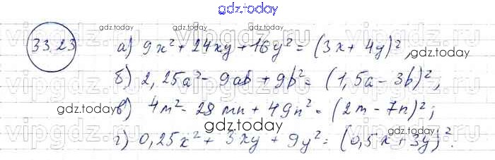 Ответы к § 33. Разложение многочленов на множители с помощью формул сокращенного умножения Решение к главе 7 23 Задачнику по Алгебре для 7 класса Мордкович, Александрова Базовый уровень Мнемозина 2013