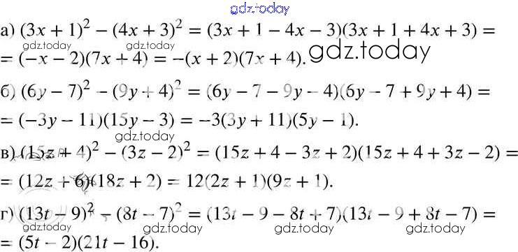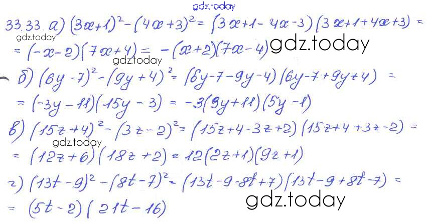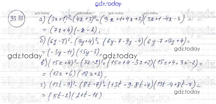 На страницах сайта gdz.today вы найдете учебный и вспомогательный материал, направленный на улучшения знаний школьной программы. ГДЗ - онлайн мир знаний § 33. Разложение многочленов на множители с помощью формул сокращенного умножения Решение к главе 7 33 Задачнику по Алгебре для 7 класса Мордкович, Александрова Базовый уровень Мнемозина 2013