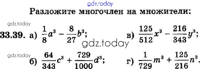 На страницах сайта gdz.today вы найдете учебный и вспомогательный материал, направленный на улучшения знаний школьной программы. ГДЗ - онлайн мир знаний § 33. Разложение многочленов на множители с помощью формул сокращенного умножения Решение к главе 7 39 Задачнику по Алгебре для 7 класса Мордкович, Александрова Базовый уровень Мнемозина 2013