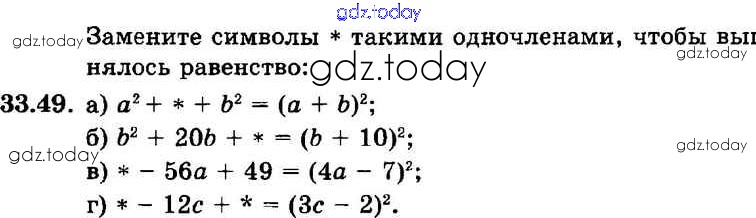 На страницах сайта gdz.today вы найдете учебный и вспомогательный материал, направленный на улучшения знаний школьной программы. ГДЗ - онлайн мир знаний § 33. Разложение многочленов на множители с помощью формул сокращенного умножения Решение к главе 7 49 Задачнику по Алгебре для 7 класса Мордкович, Александрова Базовый уровень Мнемозина 2013