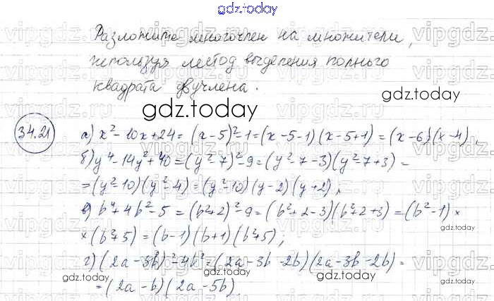 На страницах сайта gdz.today вы найдете учебный и вспомогательный материал, направленный на улучшения знаний школьной программы. ГДЗ - онлайн мир знаний § 34. Разложение многочленов на множители с помощью комбинаций различных приемов Решение к главе 7 21 Задачнику по Алгебре для 7 класса Мордкович, Александрова Базовый уровень Мнемозина 2013