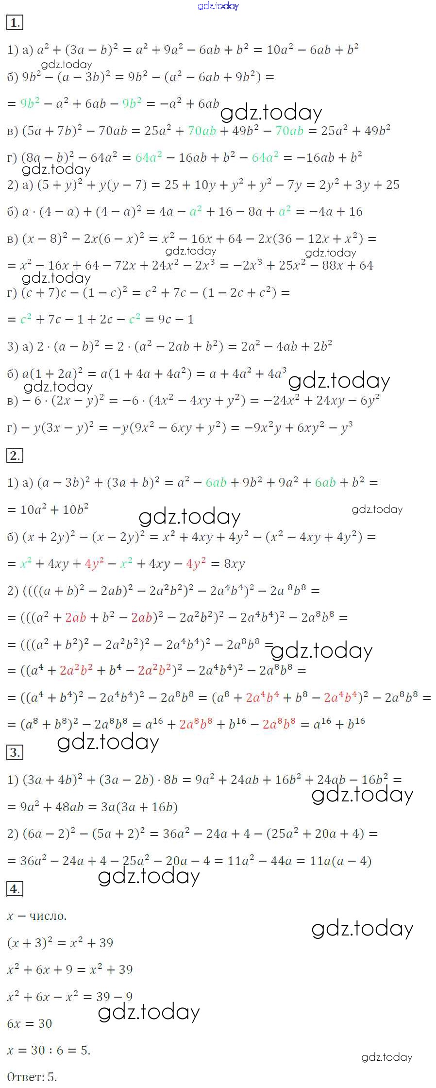 На страницах сайта gdz.today вы найдете учебный и вспомогательный материал, направленный на улучшения знаний школьной программы. ГДЗ - онлайн мир знаний Вариант 1 Решение к самостоятельным работам. Варианты С-38. Преобразование выражений с применением формул квадрата суммы и квадрата разности Дидактическим материалам по Алгебре для 7 класса Звавич, Кузнецова Просвещение 2012