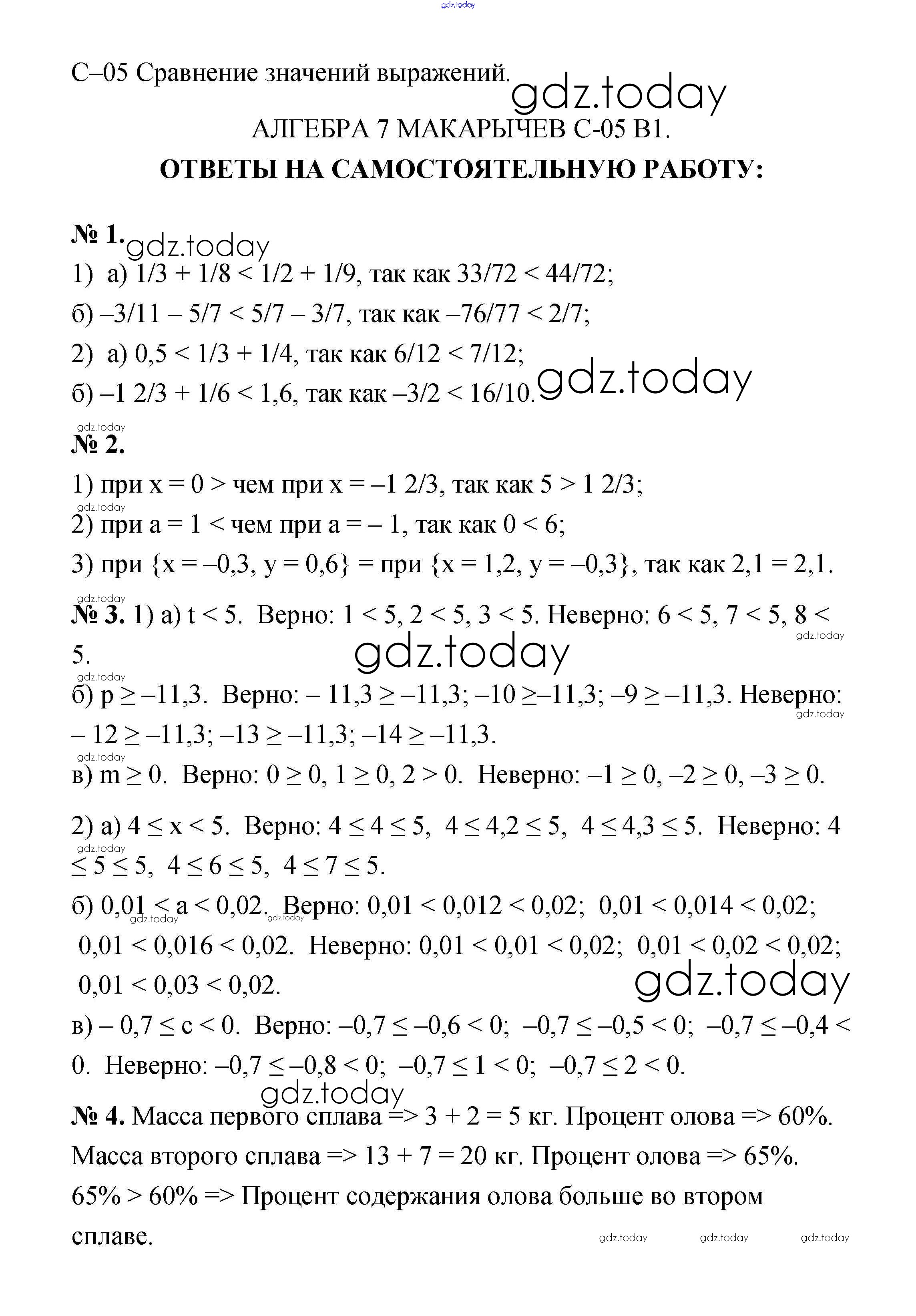 На страницах сайта gdz.today вы найдете учебный и вспомогательный материал, направленный на улучшения знаний школьной программы. ГДЗ - онлайн мир знаний Вариант 1 Решение к самостоятельным работам. Варианты С-5. Сравнение значений выражений Дидактическим материалам по Алгебре для 7 класса Звавич, Кузнецова Просвещение 2012