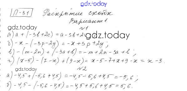 На страницах сайта gdz.today вы найдете учебный и вспомогательный материал, направленный на улучшения знаний школьной программы. ГДЗ - онлайн мир знаний ПР-31 Решение к проверочным работам вариант 1 Дидактическим материалам по Алгебре для 7 класса Евстафьева, Карп Просвещение 2018