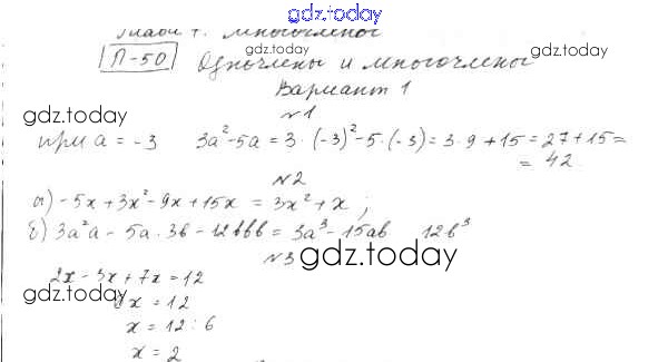 На страницах сайта gdz.today вы найдете учебный и вспомогательный материал, направленный на улучшения знаний школьной программы. ГДЗ - онлайн мир знаний ПР-50 Решение к проверочным работам вариант 1 Дидактическим материалам по Алгебре для 7 класса Евстафьева, Карп Просвещение 2018