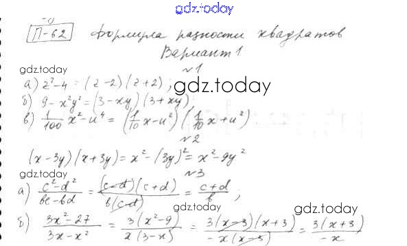 На страницах сайта gdz.today вы найдете учебный и вспомогательный материал, направленный на улучшения знаний школьной программы. ГДЗ - онлайн мир знаний ПР-62 Решение к проверочным работам вариант 1 Дидактическим материалам по Алгебре для 7 класса Евстафьева, Карп Просвещение 2018