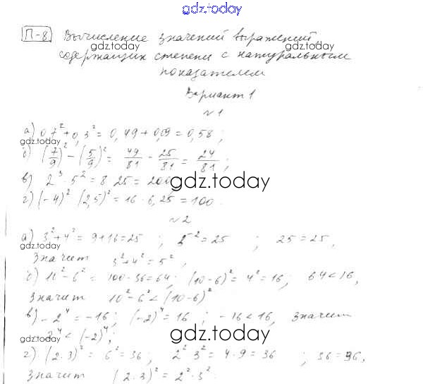 На страницах сайта gdz.today вы найдете учебный и вспомогательный материал, направленный на улучшения знаний школьной программы. ГДЗ - онлайн мир знаний ПР-8 Решение к проверочным работам вариант 1 Дидактическим материалам по Алгебре для 7 класса Евстафьева, Карп Просвещение 2018