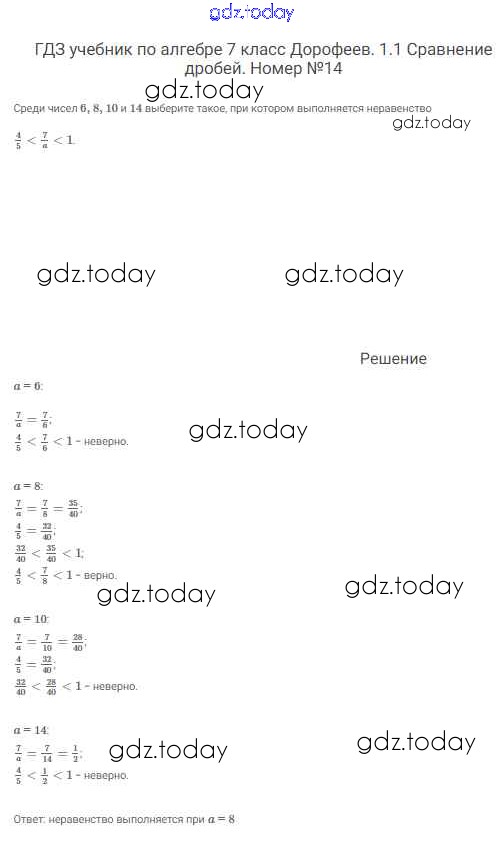 На страницах сайта gdz.today вы найдете учебный и вспомогательный материал, направленный на улучшения знаний школьной программы. ГДЗ - онлайн мир знаний Решение к упражнениям 14 Учебнику по Алгебре для 7 класса Дорофеев, Суворова Просвещение Академический школьный учебник 2020