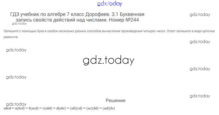 На страницах сайта gdz.today вы найдете учебный и вспомогательный материал, направленный на улучшения знаний школьной программы. ГДЗ - онлайн мир знаний Решение к упражнениям 244 Учебнику по Алгебре для 7 класса Дорофеев, Суворова Просвещение Академический школьный учебник 2020
