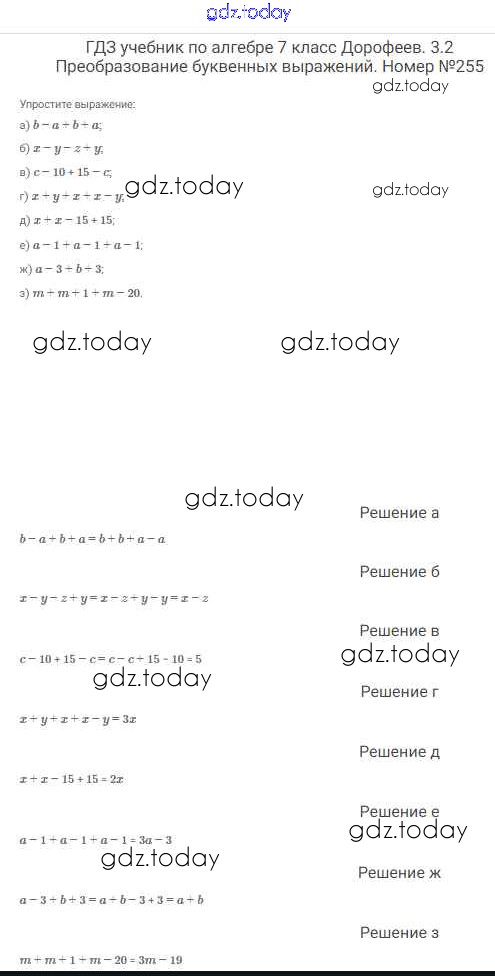 На страницах сайта gdz.today вы найдете учебный и вспомогательный материал, направленный на улучшения знаний школьной программы. ГДЗ - онлайн мир знаний Решение к упражнениям 255 Учебнику по Алгебре для 7 класса Дорофеев, Суворова Просвещение Академический школьный учебник 2020