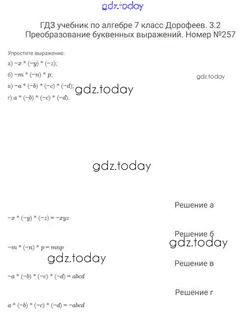 На страницах сайта gdz.today вы найдете учебный и вспомогательный материал, направленный на улучшения знаний школьной программы. ГДЗ - онлайн мир знаний Решение к упражнениям 257 Учебнику по Алгебре для 7 класса Дорофеев, Суворова Просвещение Академический школьный учебник 2020