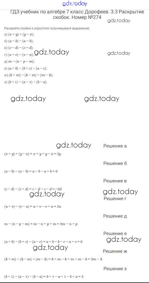 На страницах сайта gdz.today вы найдете учебный и вспомогательный материал, направленный на улучшения знаний школьной программы. ГДЗ - онлайн мир знаний Решение к упражнениям 274 Учебнику по Алгебре для 7 класса Дорофеев, Суворова Просвещение Академический школьный учебник 2020
