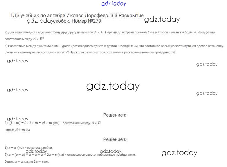 На страницах сайта gdz.today вы найдете учебный и вспомогательный материал, направленный на улучшения знаний школьной программы. ГДЗ - онлайн мир знаний Решение к упражнениям 279 Учебнику по Алгебре для 7 класса Дорофеев, Суворова Просвещение Академический школьный учебник 2020