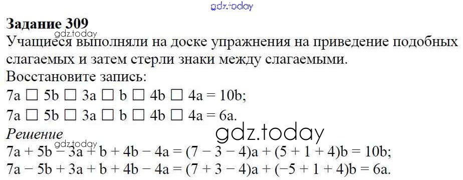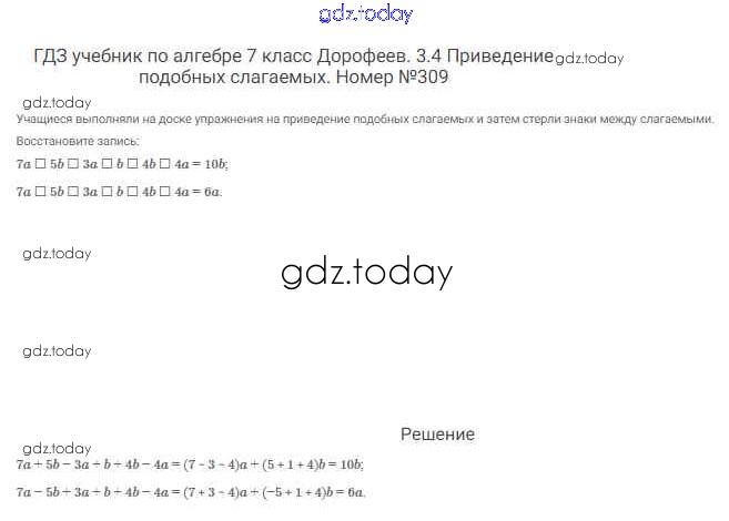 На страницах сайта gdz.today вы найдете учебный и вспомогательный материал, направленный на улучшения знаний школьной программы. ГДЗ - онлайн мир знаний Решение к упражнениям 309 Учебнику по Алгебре для 7 класса Дорофеев, Суворова Просвещение Академический школьный учебник 2020
