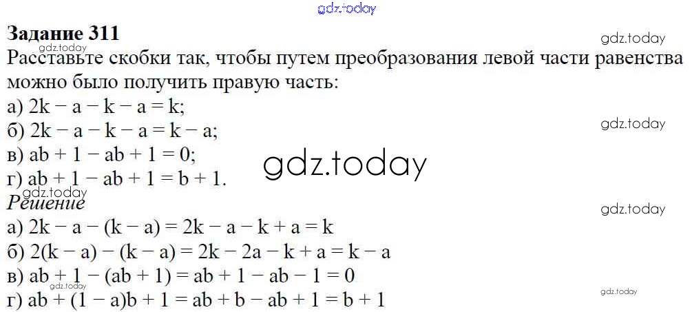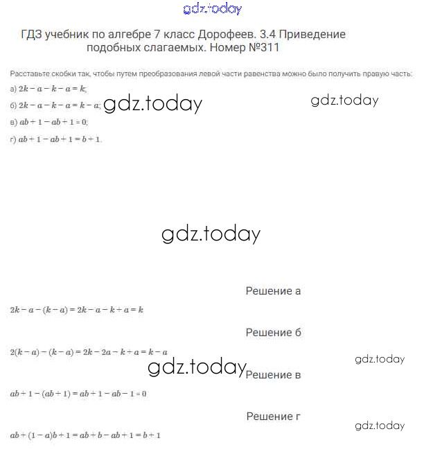 На страницах сайта gdz.today вы найдете учебный и вспомогательный материал, направленный на улучшения знаний школьной программы. ГДЗ - онлайн мир знаний Решение к упражнениям 311 Учебнику по Алгебре для 7 класса Дорофеев, Суворова Просвещение Академический школьный учебник 2020