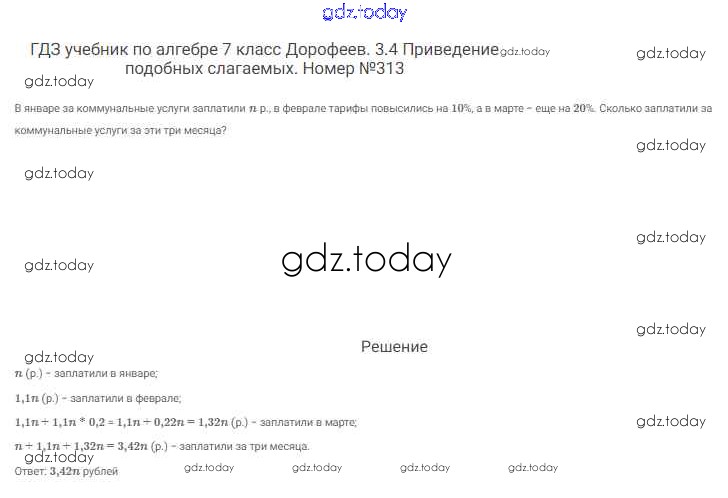 На страницах сайта gdz.today вы найдете учебный и вспомогательный материал, направленный на улучшения знаний школьной программы. ГДЗ - онлайн мир знаний Решение к упражнениям 313 Учебнику по Алгебре для 7 класса Дорофеев, Суворова Просвещение Академический школьный учебник 2020