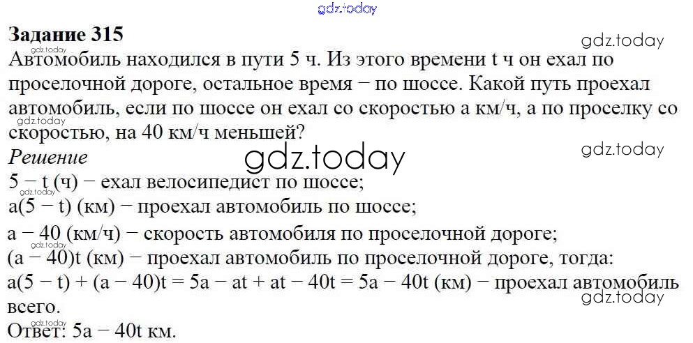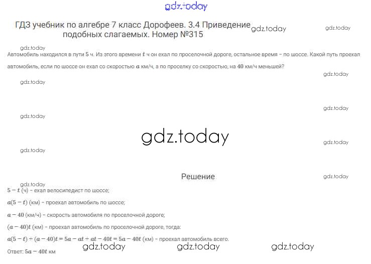 На страницах сайта gdz.today вы найдете учебный и вспомогательный материал, направленный на улучшения знаний школьной программы. ГДЗ - онлайн мир знаний Решение к упражнениям 315 Учебнику по Алгебре для 7 класса Дорофеев, Суворова Просвещение Академический школьный учебник 2020