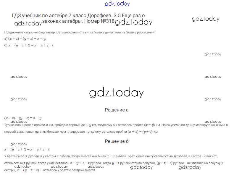 На страницах сайта gdz.today вы найдете учебный и вспомогательный материал, направленный на улучшения знаний школьной программы. ГДЗ - онлайн мир знаний Решение к упражнениям 318 Учебнику по Алгебре для 7 класса Дорофеев, Суворова Просвещение Академический школьный учебник 2020