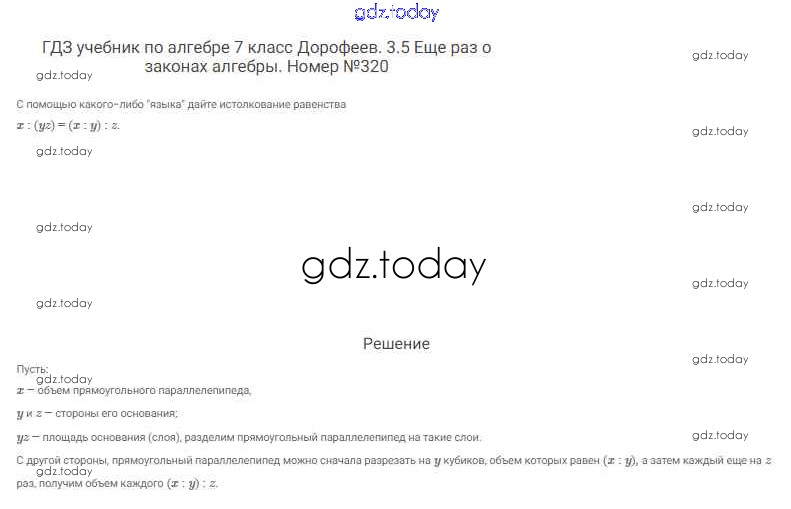 На страницах сайта gdz.today вы найдете учебный и вспомогательный материал, направленный на улучшения знаний школьной программы. ГДЗ - онлайн мир знаний Решение к упражнениям 320 Учебнику по Алгебре для 7 класса Дорофеев, Суворова Просвещение Академический школьный учебник 2020