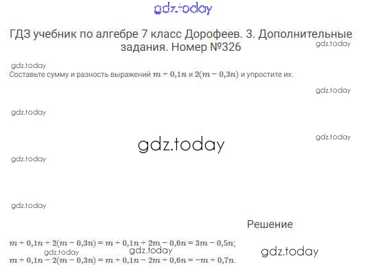 На страницах сайта gdz.today вы найдете учебный и вспомогательный материал, направленный на улучшения знаний школьной программы. ГДЗ - онлайн мир знаний Решение к упражнениям 326 Учебнику по Алгебре для 7 класса Дорофеев, Суворова Просвещение Академический школьный учебник 2020