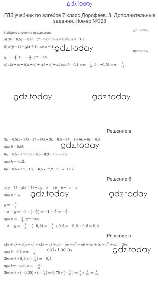 На страницах сайта gdz.today вы найдете учебный и вспомогательный материал, направленный на улучшения знаний школьной программы. ГДЗ - онлайн мир знаний Решение к упражнениям 328 Учебнику по Алгебре для 7 класса Дорофеев, Суворова Просвещение Академический школьный учебник 2020