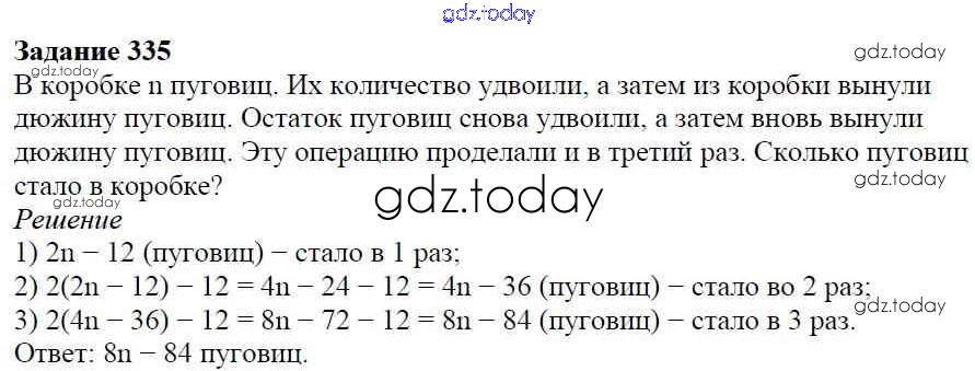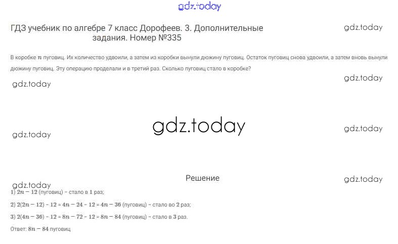 На страницах сайта gdz.today вы найдете учебный и вспомогательный материал, направленный на улучшения знаний школьной программы. ГДЗ - онлайн мир знаний Решение к упражнениям 335 Учебнику по Алгебре для 7 класса Дорофеев, Суворова Просвещение Академический школьный учебник 2020