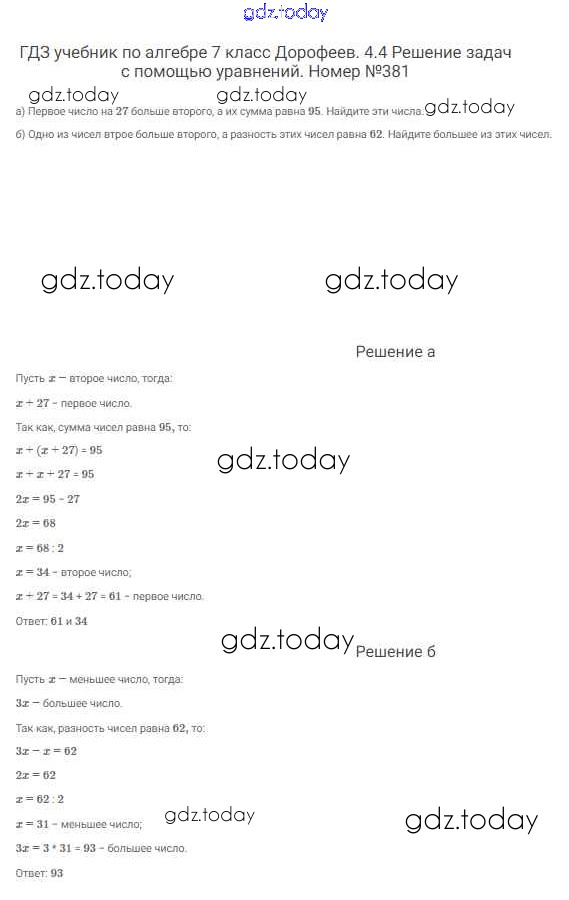 Ответы к Решение к упражнениям 381 Учебнику по Алгебре для 7 класса Дорофеев, Суворова Просвещение Академический школьный учебник 2020