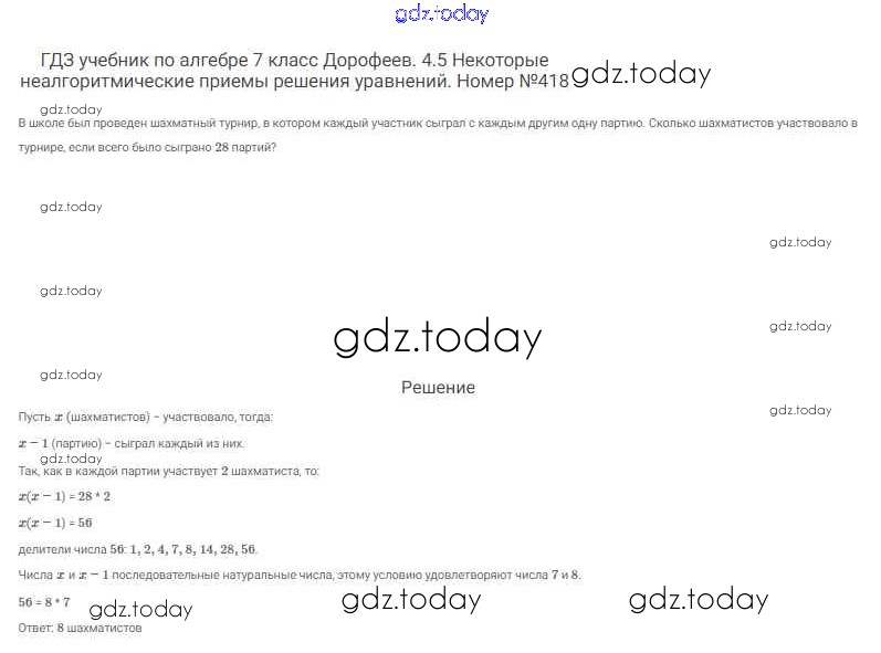 На страницах сайта gdz.today вы найдете учебный и вспомогательный материал, направленный на улучшения знаний школьной программы. ГДЗ - онлайн мир знаний Решение к упражнениям 418 Учебнику по Алгебре для 7 класса Дорофеев, Суворова Просвещение Академический школьный учебник 2020